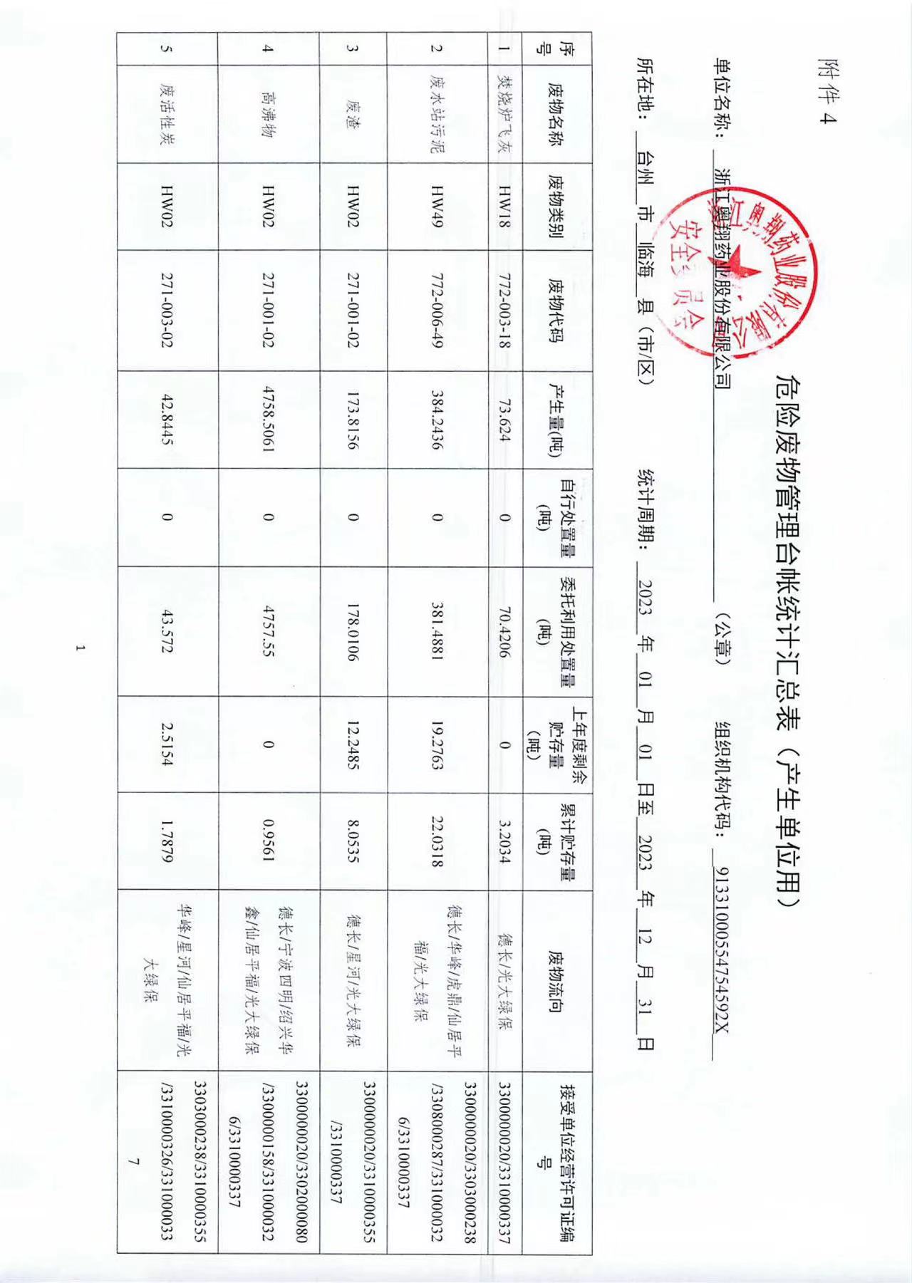 开云网页版页面2023年危险废物管理台帐统计汇总表
